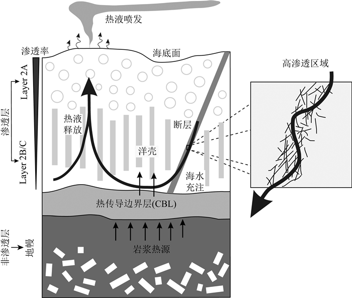 由于洋壳温度相关的弹-塑特性和静岩压力的压实作用,洋壳渗透率垂向上表现为逐渐减小的趋势,且洋壳上部喷发玄武岩层的渗透率要明显高于下部的席状岩墙层(Morgan and Chen, 1993a, 1993b),而岩浆热源和地幔部分则一般被认为是非渗透性层(Theissen-Krah et al., 2016).岩浆热源内部的热量经上覆热传导边界层(CBL)传导至洋壳渗透层,在热传导边界层,温度逐渐减小(由热源处的~1200 ℃至渗透层底部的~600 ℃, Lowell, 2010).在热传导边界层顶部的加热作用下,洋壳渗透层发生海水-围岩的热化学反应和热液对流活动(图 2),驱动上覆热液对流系统的运转,维持源源不断的海水下渗(recharge)与热液上涌(discharge)循环.