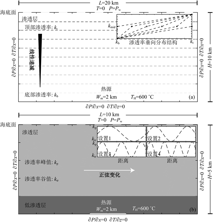 图 3 参数设置与边界条件 (a)垂向线性分布的渗透率结构; (b)水平方向上呈正弦分布的洋壳渗透率分布. Fig. 3 Parameter settings and boundary conditions (a) Vertical linear distribution of permeability; (b) Horizontally sinusoidal variation of permeability. |