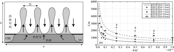 图 4 均一渗透率模型示意图(a, L为单个热液对流单元的宽度)与模型运行结果(b) Fig. 4 Cartoon for homogeneous permeability models (a, L is the width of a single convection cell) and simulation results (b) |