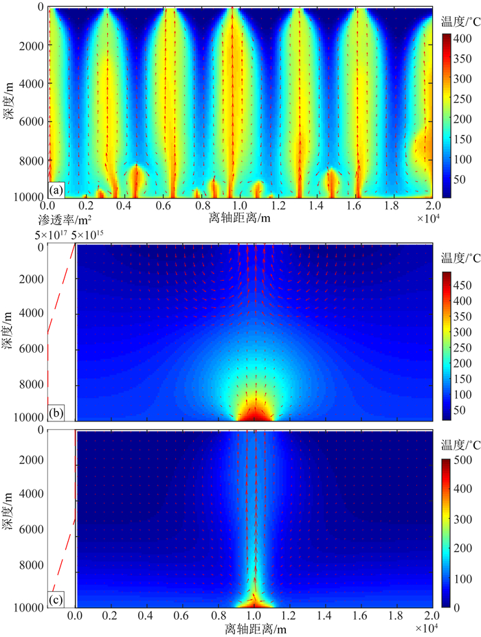 图 5 数值模拟结果 (a)均一渗透率(5×10-15 m2)、均衡加热的数值模拟结果,图中箭头表示海水或热液的运动速度(下同);(b, c)渗透率垂向线性分布、集中加热的数值模拟结果,其中,(b)模型顶界渗透率为5×10-15 m2,底界和中部节点渗透率均为5×10-17 m2,(c)模型顶界和中部节点渗透率为5×10-15 m2,底界渗透率为5×10-17 m2. Fig. 5 Simulation results (a) Homogeneous permeability (5×10-15 m2) with continuous heat source, arrows indicate the speed of seawater and hydrothermal fluid (same below); (b, c) Vertical linear distribution of permeability with localized heat source, top permeability: 5×10-15 m2, central and bottom permeability: 5×10-17 m2 in (b); and bottom permeability: 5×10-17 m2, central and top permeability: 5×10-15 m2 in (c). |