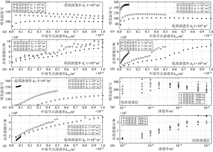 图 6 不同垂向渗透率分布模型的输出结果(喷发温度和总热流值) (a, b)顶部渗透率为1×10-14 m2; (c, d)底部渗透率为1×10-16 m2; (e, f)底部渗透率为5×10-17 m2; (g, h)不同渗透率分布的均衡加热模型. Fig. 6 Outputs for different vertical permeability distribution (venting temperature and total heat flux) (a, b) Top permeability of 1×10-14 m2; (c, d) Bottom permeability of 1×10-16 m2; (e, f) Bottom permeability of 5×10-17 m2; (g, h) Homogeneous heating models with different permeabilities. |