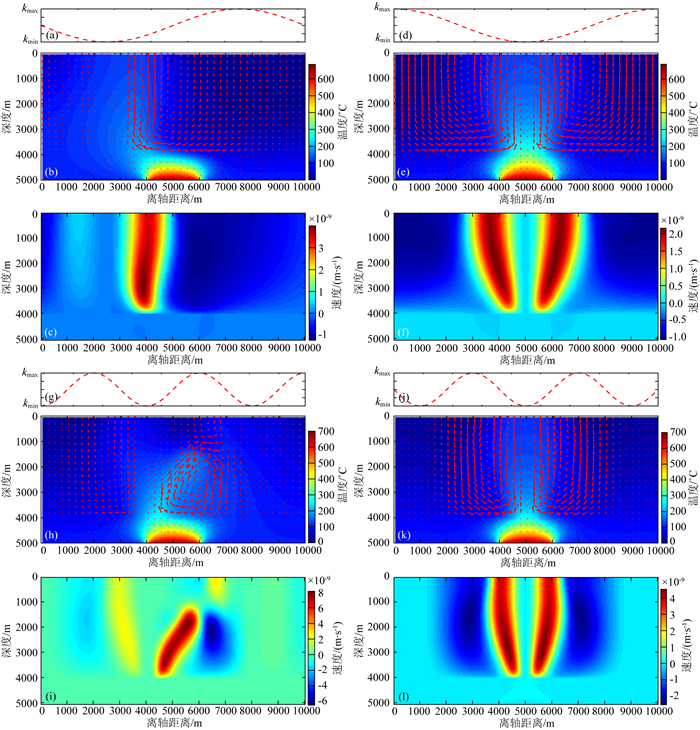 3.3 水平方向变化的渗透率结构相较于渗透率的垂向变化,为了模拟不同的洋壳渗透率水平变化,本文将模型底界的岩浆热源放置在垂向均一,水平方向正弦分布渗透率的不同相位(图 3b)之下,以检验稳态下洋壳渗透率的水平变化对热液对流形态的影响.