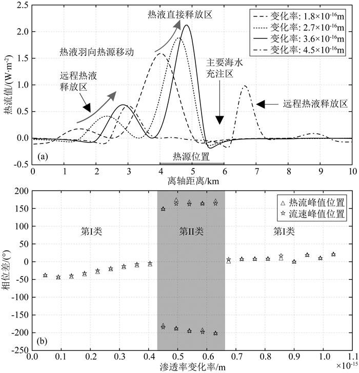 为了直观显示渗透率水平变化对热液对流的偏移影响,本文整理了稳态模型的热流值剖面(图 8a),以及热液喷发位置与热源(固定于0°相位,图 8b)间的相位差来表示热液羽的水平偏移程度和渗透率水平变化之间的关系.