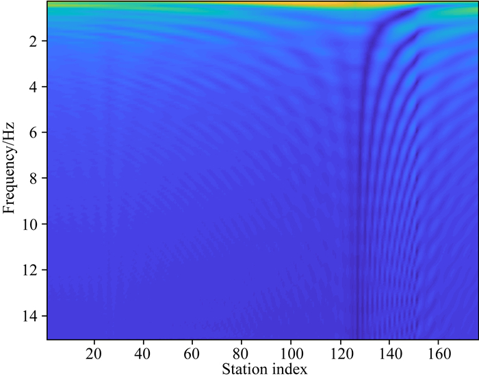 图 5 图 4中地表波场的频率-空间域分布,模型如图 3所示 Fig. 5 The wave field in frequency-space domain. The model is shown in Fig. 3 |