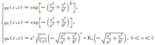 选择不同类型的自相关函数可以得到不同介质特征的随机介质模型,常用的随机介质模型有指数型、高斯型和Von Kármán型(Wu and Aki, 1985;Frankel and Clayton, 1984;Goff and Jordan, 1988;Roth and Korn, 1993),其自相关函数分别为: