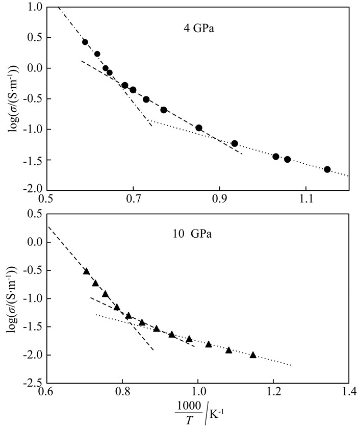 在一定的温度范围内,样品只有一种主要的传导机制.logσ与1/T之间的图像上,直线斜率的变化表示导电机制发生了变化.本次的实验数据显示在随着温度的升高,电导率不断增加,但在不同温度段升高的速率不一样,如图 5所示,以4 GPa和10 GPa的数据为例,将数据分成了三段,结合激活焓的数值认为低温段和中温段的导电机制都可能是小极化子导电(和三价铁相关)为主,但样品在不同温度段内的成分略有不同,低温段,起始样品内没有成分上的变化,中温段,6 GPa压力下斜方辉石可能相变成单斜辉石,10 GPa压力下辉石开始固溶到石榴石中,石榴石变成超硅石榴石,所以虽然都是小极化子导电,但是激活焓的大小不同.高温段,样品内的导电机制以离子导电(和镁的空穴相关)为主.
