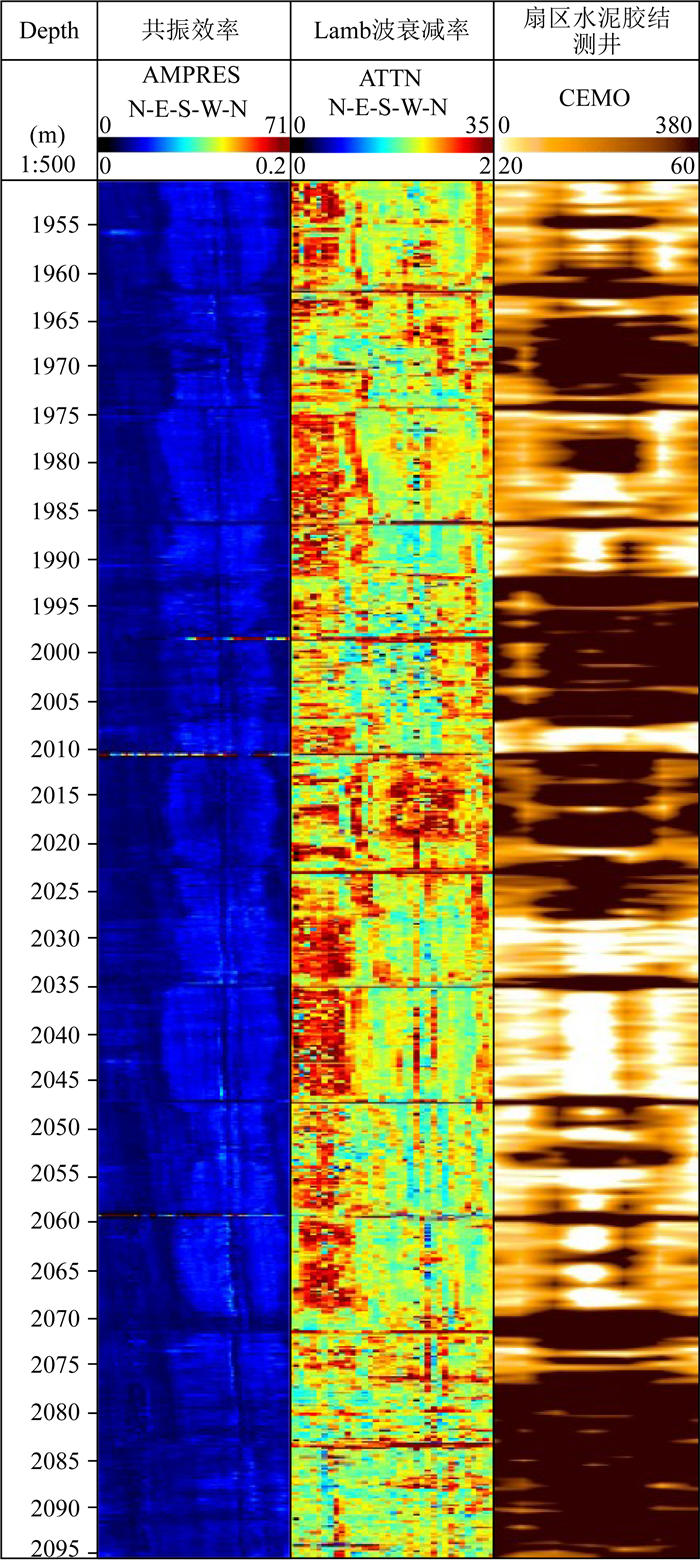 CBL或SBT测井时套管波幅度升高或衰减降低可能是存在微环或者某扇区胶结差的响应特征, 微环一般认为不会造成流体窜槽, 但胶结差的情况需要再次注入水泥才能进行油气开采.如何区分微环还是水泥与套管之间胶结差一直是固井质量评价的难点, 目前常用的方法是在套管内加压, 再次测井, 对比加压前后的测井响应, 判断是否有微环, 这种方式需要重复测井, 测井成本很高.根据图 8和图 9给出的拉伸波和弯曲型兰姆波的微环响应特征, 可以联合IBC和SBT或CBL等测井数据识别微环, 图 13是某井的固井质量测井成果图, 水泥密度是1.9 g·cm-3, 套管稍有偏心.第4道给出的SBT测井结果显示在2030~2068 m拉伸波(准S0)的衰减率在0°~360°都很低, 接近自由套管的衰减值(约4 dB/m), 这可能是套后水泥胶结差或存在微环造成的, 结合第3道IBC测量的弯曲型兰姆波(准A0)的衰减率可知0~100度扇区的衰减值很高, 达到120 dB/m, 这对常规水泥胶结好时的衰减率(约60 dB/m)相比增加很多, 通过图 9a可知造成这一现象与套后有微环的响应特征一致, 通过第二道IBC仪器垂直入射方式测量的共振效率在此扇区比较低, 也可佐证是微环的响应特征; 另一半扇区弯曲型兰姆波的衰减值在50 dB/m附近, 结合SBT的测井结果可确认此扇区水泥胶结差或套管和水泥之间的流体环厚度较大.