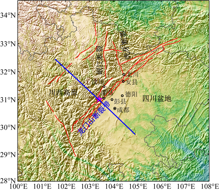 图 1 汶川地震构造背景及模型剖面位置 紫色五角星为汶川地震主震位置,蓝色线为模型剖面位置. Fig. 1 Tectonic setting of the Wenchuan earthquake and the model profile location The mainshock location is indicated by purple star, the blue line is the model profile location. |