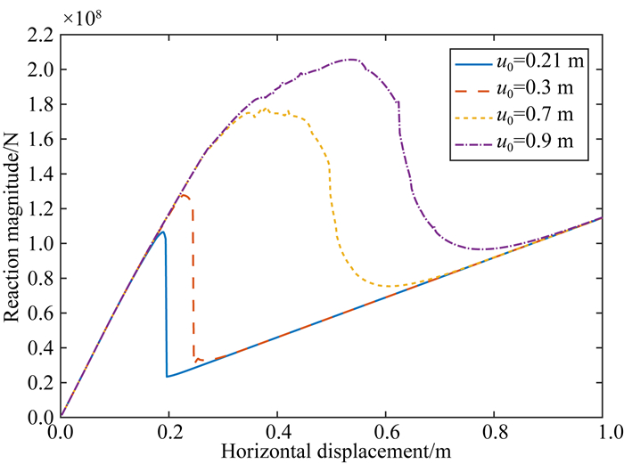 图 10 强度曲线胖度参数取不同值时的平衡路径曲线 u0=0.7 m和u0=0.9 m为稳定状态,u0=0.21 m和u0=0.3 m为失稳状态. Fig. 10 The equilibrium path curve with different fatness parameters of strength curve u0=0.7 m and u0=0.9 m are stable states, u0=0.21 m and u0=0.3 m are unstable states. |
