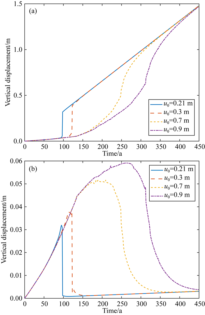 图 11 强度曲线胖度参数取不同值时龙门山断裂带两盘地表处垂直位移随时间的变化 (a) 川西高原一侧A点;(b) 四川盆地一侧A′点. u0=0.7 m和u0=0.9 m为稳定状态,u0=0.21 m和u0=0.3 m为失稳状态. Fig. 11 Variation of vertical displacement with time at the surface of two sides of the Longmenshan fault zone with different fatness parameters of strength curve (a) Point A on the side of the Western Sichuan Plateau; (b) Point A′ on the side of the Sichuan Basin. u0=0.7 m and u0=0.9 m are stable states, u0=0.21 m and u0=0.3 m are unstable states. |