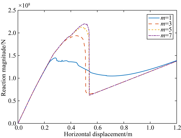 图 12 强度曲线形状参数取不同值时的平衡路径曲线 m=1为稳定状态,m=3,m=5和m=7为失稳状态. Fig. 12 The equilibrium path curve with different shape parameters of strength curve m=1 is stable state, m=3, m=5 and m=7 are unstable states. |