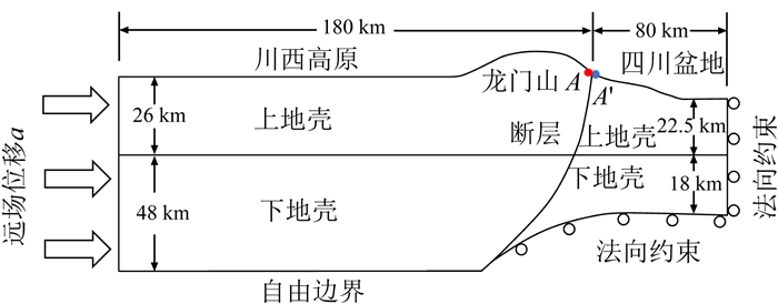 过图 1中剖面建立垂直于龙门山断裂带,包含川西高原和四川盆地在内的汶川地震不稳定性二维平面应变地震力学模型,如图 2所示.模型取从地表到Moho面深度的纵剖面,四川盆地与川西高原以龙门山断裂带为界.龙门山断层带、川西高原和四川盆地共同组成统一的断层围岩岩石力学系统.川西高原地形高度取为4 km,四川盆地地形高度取500 m,龙门山断裂带高度取为3 km,向东逐渐降低,10 km后降到四川盆地高度.龙门山断裂带两盘在地表位置的川西高原一侧为点A,四川盆地一侧为点A′.模型右侧的四川盆地Moho面深度取为40 km,上地壳厚度取为22.5 km;左侧的川西高原Moho面深度为70 km,上地壳和下地壳厚度分别为26 km和48 km.考虑到四川盆地所在的华南地块相对川西高原运动速度很低,可视为固定不动,川西高原一侧受构造加载的推挤作用.因此,在图 2右端面和四川盆地Moho面取法向约束,在川西高原左端面施加远场位移a,Moho面取自由边界.这样的边界条件模拟了下地壳物质向上运动的趋势,有利于断层解锁.
