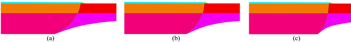 图 3 龙门山断裂带深浅部不同倾角的3组有限元模型 (a)模型1;(b)模型2;(c)模型3. Fig. 3 Three finite element models of different dip in the deep and shallow parts of the Longmenshan fault zone (a) Model-1; (b) Model-2; (3) Model-3. |