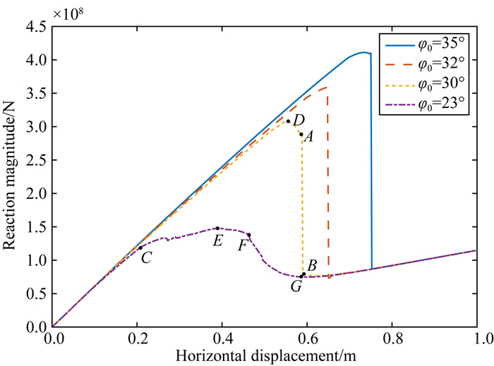 图 4 初始内摩擦角取不同值时的平衡路径曲线 φ0=23°为稳定状态,φ0=30°,φ0=32°和φ0=35°为失稳状态. Fig. 4 The equilibrium path curve with different initial internal friction angle φ0=23° is stable state, φ0=30°, φ0=32° and φ0=35° are unstable states. |