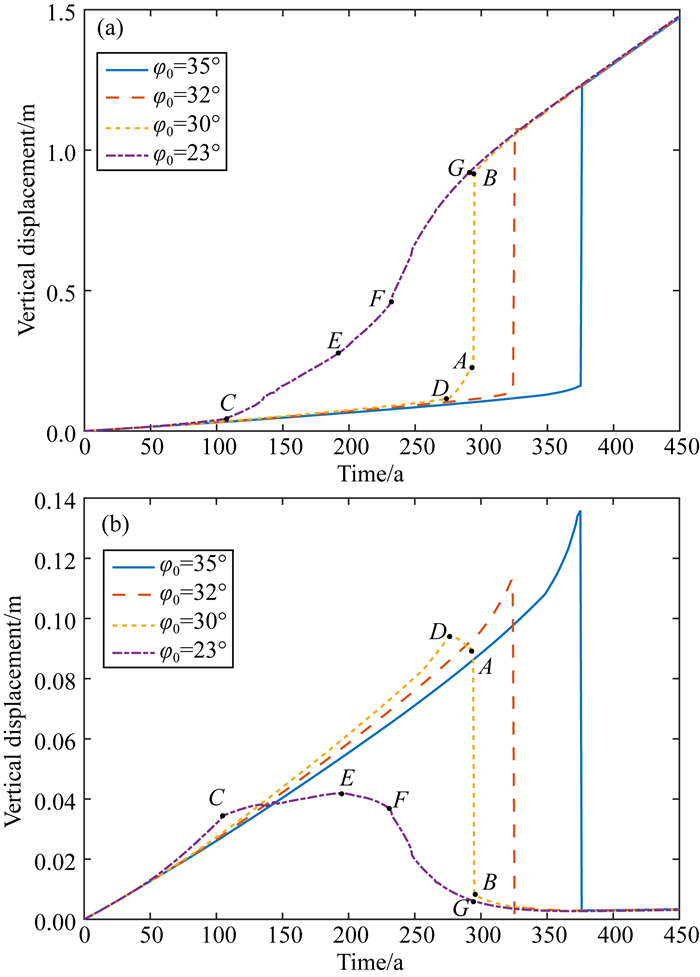 图 5 初始内摩擦角取不同值时龙门山断裂带两盘地表处垂直位移随时间的变化 (a) 川西高原一侧A点;(b) 四川盆地一侧A′点. φ0=23°为稳定状态,φ0=30°,φ0=32°和φ0=35°为失稳状态. Fig. 5 Variation of vertical displacement with time at the surface of two sides of the Longmenshan fault zone with different initial internal friction angle (a) Point A on the side of the Western Sichuan Plateau; (b) Point A′ on the side of the Sichuan Basin. φ0=23° is stable state, φ0=30°, φ0=32° and φ0=35° are unstable states. |