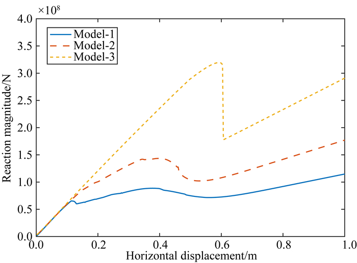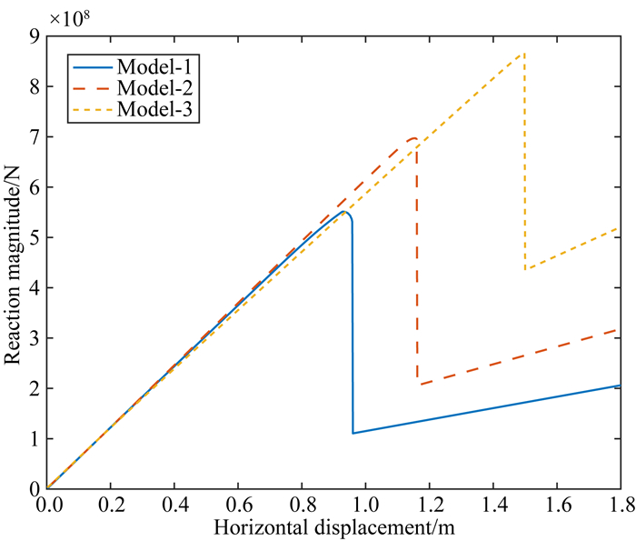 图 6 龙门山断裂带深浅部倾角取不同值时的平衡路径曲线 Model-1和Model-2为稳定状态,Model-3为失稳状态. Fig. 6 The equilibrium path curve with different dip in the deep and shallow parts of the Longmenshan fault zone The Model-1 and Model-2 are stable states, the Model-3 is unstable state. |