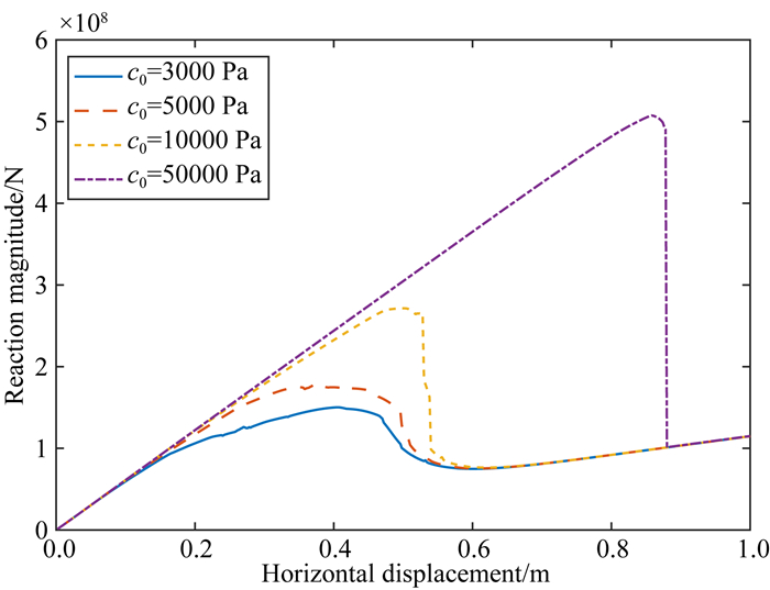 为分析断层初始黏聚力对地震失稳的影响,对于模型1,取计算参数为u0=0.7 m,m=2,φ0=25°时,分别计算了初始黏聚力c0取不同值时的平衡路径曲线,如图 9所示.由图可知,当初始黏聚力增加时,断层逐渐从稳定的缓慢无震滑动状态转变到失稳状态.并且初始黏聚力越大,地震失稳突跳时对应的远场位移越大,应力降也越大.这表明断层初始黏聚力越大,断层更容易处于闭锁状态,闭锁时间越长,克服闭锁状态需要的剪应力也越大.在断层闭锁期间,随远场位移的增加,断层附近围岩持续变形,将有利于积累更多的应变能.当断层面内剪应力超过克服闭锁状态需要的临界剪应力时,围岩储存的大量应变能容易在极短的时间内得到释放,伴随应力降和断层突然错动,导致地震发生.初始黏聚力越小,断层克服闭锁状态需要的剪应力越小,断层容易滑动,这导致断层附近围岩不容易发生持续变形,进而积累更多的应变能.围岩存储的应变能更容易在断层缓慢无震滑动中释放掉,不会发生地震.对于汶川MS8.0特大地震而言,断层的初始黏聚力可能非常大,这样导致地震的孕育时间非常长,能积累极大的应变能.