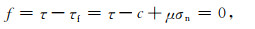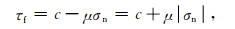 式中σn是垂直断层面的正压力,按弹性力学约定,以拉应力为正,因此正压力本身取负值.μ和c是断层的材料参数,分别称为断层面的内摩擦系数和黏聚力,且有关系φ=arctan μ,φ是内摩擦角.如果断层面内剪应力用τ表示,那么断层的破裂准则为