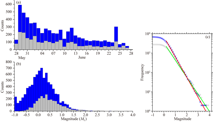图 7 自动目录与人工目录事件数量对比 (a) 每天地震数量对比;(b) 不同震级段的地震数量对比;(c) 两个目录的G-R关系图. 蓝色表示自动处理,灰色表示人工处理. Fig. 7 Comparison of events number between automatic and manual catalogs (a) Comparison of the number of earthquakes per day; (b) Comparison of the number of earthquakes in different magnitude bins; (c) G-R diagram of the two catalogs. The blue and gray color show automatic and manual catalogs, respectively. |