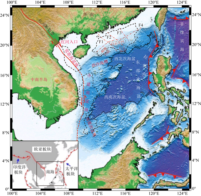 图 1 南海地形及其周边构造单元 红色虚线是断层分布(孙珍等,2005);黑色虚线是沉积盆地范围(珠江口盆地、莺歌海盆地、中建南盆地、南薇西盆地以及珠江口盆地内的顺德凹陷、白云主凹和白云南凹). Fig. 1 Topography of the South China Sea and its surrounding structural units The red dashed line is the faults (Sun et al., 2005); the black dashed line is the sedimentary basins (Pearl River Mouth Basin, Yinggehai Basin, Zhongjian South Basin, Nanweixi Basin, as well as the Shunde Sag, Baiyun main Sag and Baiyun South Sag in the Pearl River Mouth Basin). |
