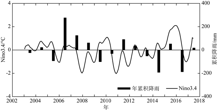 图 10 2003-01—2017-06间Niño3.4指数与维多利亚湖流域累积降雨的对比,Niño3.4指数经过5个月窗口滑动平均以摄氏度为单位,累积降雨以mm为单位 Fig. 10 Comparison between Niño3.4 Index and annual cumulative precipitation from January 2003 to June 2017, the Niño3.4 index is smoothed with 5 months windows, and measured in degrees Celsius, the annual cumulative precipitation is measured in mm |