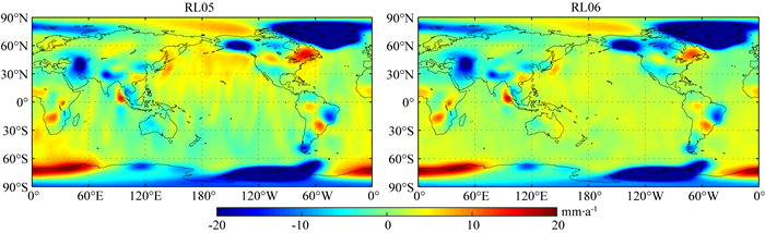 图 2 GRACE RL05与RL06版本球谐位系数计算得到的2003-01—2017-06全球等效水高变化速率(mm·a-1) Fig. 2 Global terrestrial water storage trend from January 2003 to June 2017 estimated from GRACE Release-05 spherical harmonic coefficient products and Release-06 spherical harmonic coefficient products (in mm·a-1 of equivalent water height) |
