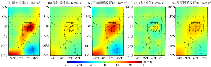 图 3a为原始Mascon结果,图 3b为进行与球谐位系数相同处理后的Mascon结果,图 3c为用正向建模改正泄漏误差后的结果,图 3d为原始信号和正向建模结果的差值,图 3e为用尺度因子改正泄漏误差后的结果.结果表明进行与球谐位系数一致处理后的Mascon信号,信号强度减弱约55%,同时信号在空间上也存在泄漏,说明高斯滤波虽然可以抑制噪声,但是同时也会削弱真实信号.经过正向建模恢复后的信号,强度趋近于原始信号,与原始信号强度相差7%左右,而且信号空间分布上也与原始信号基本一致.相比之下尺度因子方法不论信号强度还是空间位置恢复结果都与原始信号有一定区别.数据模拟结果说明正向建模方法改正维多利亚湖流域泄漏误差的效果更好.