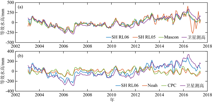为比较不同时间序列间的相似程度,分别计算了不同时间序列间的相关系数和纳什效率系数,相关系数见表 1,纳什效率系数见表 2.结合两表中的数据得出相比于RL05 SH,RL06 SH与卫星测高和Mascon更接近,能更准确地反映水储量变化.Mascon结果相比球谐位系数结果与卫星测高更接近,认为Mascon结果能更准确地反映水储量变化.Noah和CPC较为一致,但与GRACE和卫星测高结果区别较大.