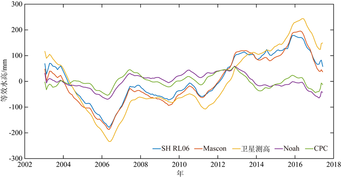GRACE和卫星测高结果在2016-03—2017-06存在一个减小趋势,SH估算得到的变化速率为-100.3 mm·a-1,Mascon估算的速率为-129.7 mm·a-1,卫星测高得到的速率为-105.4 mm·a-1,Noah和CPC也存在减少的趋势但速率远小于前者(见表 4).2016—2017的年累积降雨较少,这可能是造成2016—2017流域陆地水储量减少的原因. 2016-03—2017-06间GRACE探测到的陆地水储量变化速率比卫星测高大,而2003-01—2017-06的变化速率则是卫星测高较大,其可能的原因是GRACE在任务结束前期卫星运行和观测状态变差,误差可能相对较大.此外GRACE和卫星测高所观测到的信息不同,在不同的时间段变化可能存在差异.