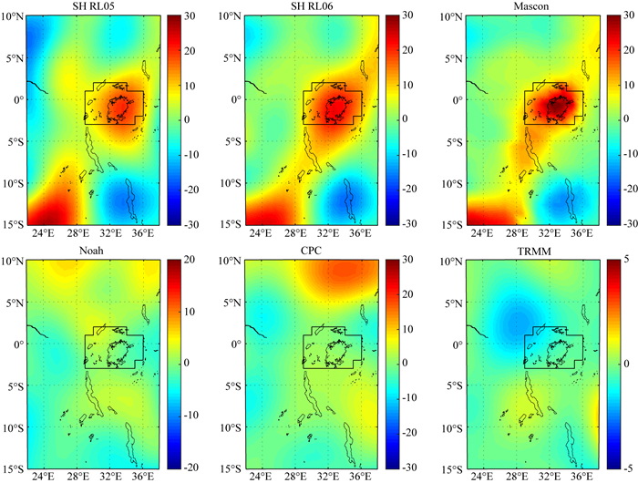 为获取陆地水储量的年际变化,对时间序列进行13个月窗口的滑动平均以减弱季节性的周期信号,结果见图 6.根据滑动平均结果可以将本文研究的时间段分为5段,即2003-01—2006-05水储量明显减少,2006-06—2007-06水储量明显增加,2007-07—2011-03水储量无明显变化趋势,2011-04—2016-02水储量增加和2016-03—2017-06水储量明显减少.水文模式反映出的陆地水储量变化幅度比GRACE和卫星测高小,这主要因为水文模式反映的主要是因气候变化引起的土壤水和植被冠层含水变化,不包含地下水、湖泊水体和人类活动影响.此外水文模式与GRACE和卫星测高在2013—2016的变化趋势存在明显差异,GRACE和卫星测高在此时间段探测到水储量增加而水文模式探测到水储量减少,推测这一现象由人类活动造成.此前的研究结果表明人类活动对维多利亚湖流域水储量的影响极大,2003-01—2006-05的水储量减少是由干旱和大坝排水量加大共同造成(Awange et al., 2013; Nanteza et al., 2016; Swenson and Wahr, 2009).但由于大坝排水量数据不实时公开,因此判断水储量变化是否受到很大的人为影响有一定困难,本文将在下一节利用公开的多源卫星数据分析造成2013—2017年水储量变化可能的原因.