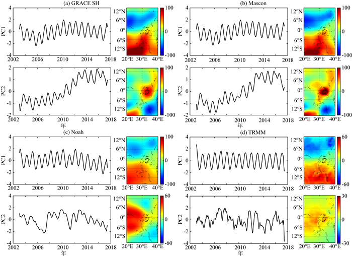 为进一步分析GRACE数据、土壤水和降雨数据间的关系,用PCA(Principal Component Analysis)方法分离空间模态和时间模态(Preisendorfer, 1988).图 8为2003-01—2017-06间GRACE、Noah和TRMM数据的PCA结果,图 8a为RL06 SH的时间模态和空间模态,图 8b为Mascon的时间模态和空间模态,图 8c为Noah的时间模态和空间模态,图 8d为降雨的时间模态和空间模态.SH第一模态信号占比55%,第二模态信号占比19%,Mascon第一模态信号占比54%,第二模态信号占比25%,Noah第一模态信号占比57%,第二模态信号占比18%,TRMM第一模态信号占比90%,第二模态信号占比5%.四组数据第一模态呈周期信号,第二模态与年际变化信号相似.相比陆地水储量,降雨的周期信号占比更高,年际变化占比较低.GRACE和Noah周期信号的波谷出现在每年的9月前后,波峰出现在3月前后,TRMM数据的波谷出现在6月前后,波峰出现在1月前后,对比陆地水和降雨波峰和波谷出现的时间,陆地水变化相比降雨有两个月左右的滞后.GRACE、Noah和TRMM在2006年前后处于多年较低值,与气象资料记录的该地区在这一时期处于干旱状态一致.GRACE的第二模态在维多利亚湖流域及其东南方的马拉维湖流域呈现明显的变化信号.Noah和TRMM第二模态的变化信号主要出现在流域西侧,Noah在马拉维湖流域也呈现出变化信号但信号强度低于GRACE.GRACE与Noah和TRMM变化信号的空间分布存在一定差异,这可能是因为GRACE探测到的水储量变化受流域集水区的径流、降雨和蒸散的共同影响,而不仅仅与流域范围内的降雨有关.