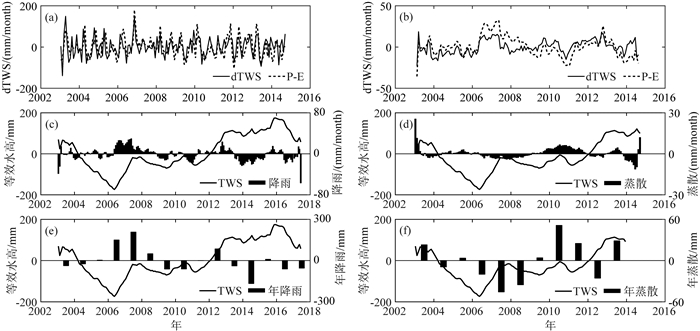 陆地水变化是一段时间内降雨P、蒸散E和径流R之和,水平衡方程为ΔS=P-E-R.由于未获取到径流数据,且维多利亚湖流域的水储量大部分通过降雨补充,水储量大部分通过蒸散损失(Awange and Ong′ang′a, 2006),故仅对比降雨、蒸散与等效水高.图 9为SH等效水高变化与降雨和蒸散的对比,dTWS代表的是等效水高逐月变化,时间序列均扣除了对应时间段的平均值.图 9a是陆地水储量变化ΔS和P-E的时间序列,图 9b是经过13个月窗口滑动平均后的ΔS和P-E的时间序列.图 9c和图 9d分别是经过13个月窗口滑动平均后的TWS和月降雨与月蒸散的对比.陆地水储量变化受一段时间内总的降雨和蒸散变化的影响,相比气候变化有一定的延迟,故本文还对比了流域内陆地水储量变化和年累积降雨与蒸散,图 9e和图 9f分别是经过13个月窗口滑动平均后的TWS和年累积降雨与年累积蒸散的对比.
