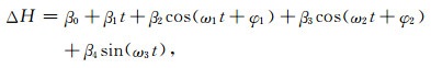 式中,β1为长期趋势,β2、β3和β4为周年、半周年和161天周期项信号的振幅,φ1和φ2为周年和半周年信号的相位,ω1=2π,ω2=4π,ω3=4.5342π分别代表一年周期项、半年周期项和161天周期项,拟合结果见表 3.