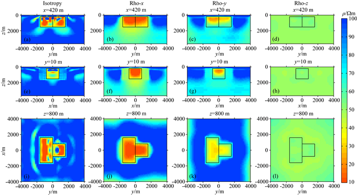 图 10 第一列为各向同性反演结果,第二列为X方向电阻率反演结果,第三列为Y方向电阻率反演结果,第四列为Z方向电阻率反演结果 Fig. 10 The first column is the isotropic inversion result.The second column is the inversion result of X direction resistivity. The third column is the inversion result of Y direction resistivity. The fourth column is the inversion result of Z direction resistivity |