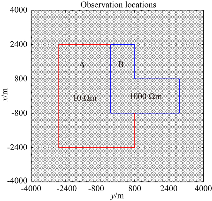 图 2为测点分布及模型俯视图,测点在X和Y方向间距160 m,共2500个测点.模型为一个低阻体(10 Ωm)与高阻体(1000 Ωm)的组合模型,并在空间上接触面较多.模型的空间分布进一步在图 3第一列显示,背景电阻率为100 Ωm.为了进行约束反演研究,这里进一步建立了如图 4所示的速度模型,背景值为4000 m·s-1,低速异常体为2000 m·s-1,高速异常体为6000 m·s-1.该速度异常体与电阻率的结构分布一致.