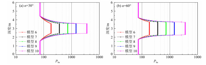由图 11b可知,相对井斜角为60°时,Rha不能识别邻围岩的一层薄层,从而出现电阻率反转特性,而在相对井斜角为30°时,Rha对Rha薄层识别能力较低,Rha不能识别邻无限厚围岩的两层薄层,使其未出现电阻率翻转现象;并且在相对井斜角较小时,Rha对于中间薄层视电阻率曲线响应趋于平缓,响应值反映薄互层宏观水平电阻率;相对井斜角较大时,对薄互层识别能力较高,未出现电阻率特征反转特性,其响应峰值、谷值接近薄互层水平电阻率真值.