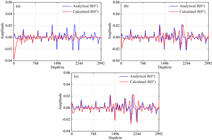 图 10 Marmousi模型不同照明补偿策略成像5250 m处抽道对比结果 (a) 不带照明补偿补偿的RTM成像结果(红色实线)与理论零角度反射系数(蓝色实线)对比结果;(b) 基于Plessix和Mulder(2004)给出照明补偿算子RTM成像结果(红色实线)与理论零角度反射系数(蓝色实线)对比结果;(c) 基于本文给出的照明补偿算子RTM成像结果(红色实线)与理论零角度反射系数(蓝色实线)对比结果. Fig. 10 Comparison of selected traces between imaging results (red solid line) and theoretical normal reflection coefficient values (blue solid line) (a) RTM imaging results calculated without illumination compensation; (b) RTM imaging results calculated with illumination compensation operator of Plessix and Mulder (2004); (c) RTM imaging results calculated with illumination compensation operator proposed in this paper. |