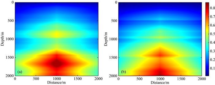 图 4 四层速度模型的总照明补偿强度对比 (a) 利用Plessix和Mulder (2004)给出的照明补偿算子计算得到的照明补偿强度;(b) 利用本文给出照明补偿算子(8)和(10)式计算得到的照明补偿强度. Fig. 4 Comparison of total illumination compensation intensity for four-layer model (a) The illumination compensation intensity calculated using the operators proposed in Plessix and Mulder (2004); (b) The illumination compensation intensity calculated using the operators (8) and (10). |
