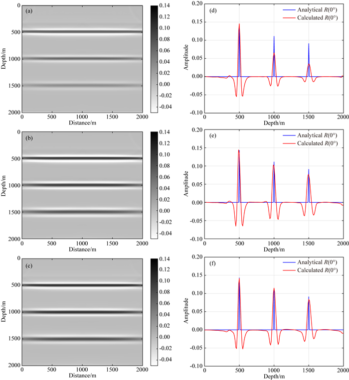图 5 四层模型不同照明补偿策略成像结果对比 (a) 不带照明补偿补偿的RTM成像结果;(b) 利用Plessix和Mulder(2004)给出的照明补偿算子得到的RTM成像结果;(c) 利用本文给出的照明补偿算子得到的RTM成像结果;(d)-(f) 分别为(a)-(c)抽取中间道的成像结果(红色实线)与真实零角度反射系数(蓝色实线)对比. Fig. 5 Comparisons of imaging results with different illumination compensation operators for four-layer model (a), (b) and (c) Imaging results without illumination, with compensation operator of Plessix and Mulder (2004) and the compensation operator proposed in this paper, respectively; (d), (e) and (f) Comparison for selected central traces between imaging results (red solid line) and theoretical normal reflection coefficient values (blue solid line) corresponding to (a), (b) and (c), respectively. |