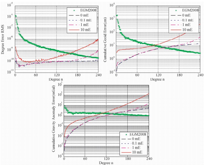 其次,为了比较调和分析法与LSC法解算结果的精度,利用含有噪声的45′×45′全球SGG张量Tzz分量格网平均值数据,基于调和分析法恢复地球重力场模型,其对应的重力场模型阶误差RMS、累计大地水准面和重力异常误差如下图 2所示,下表 2表示加入不同误差的Tzz数据恢复240阶重力场模型对应的精度统计结果.
