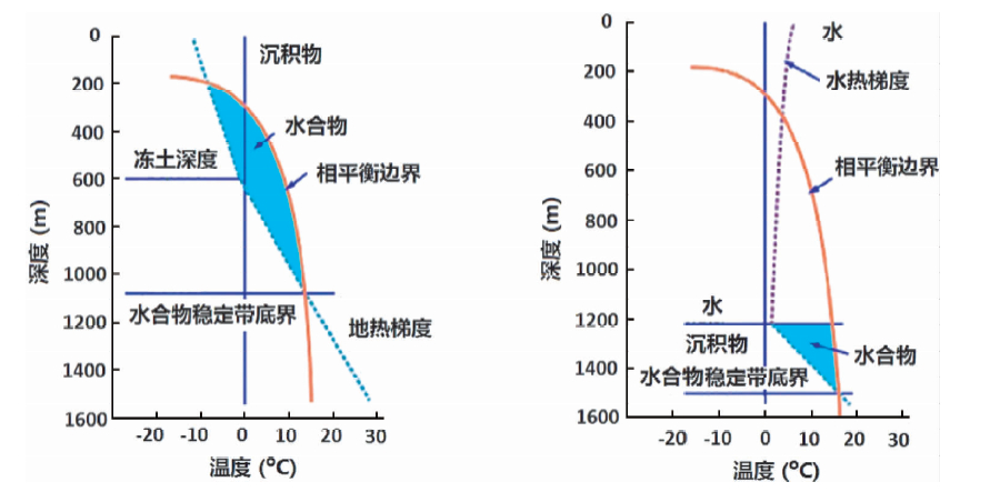 ![]() | 图 1 自然界水合物存在相图(Kvenvolden et al., 2001) (a)陆地冻土水合物存在范围;(b)海底水合物存在范围. Fig. 1 Natural gas hydrate phase equilibrium |