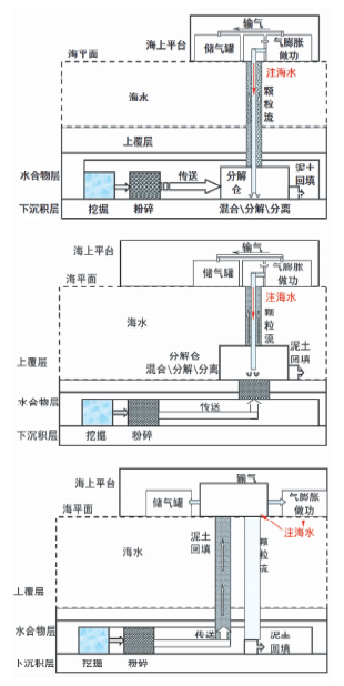 考虑如下机械-热采的基本流程:地下挖掘→粉碎→传送→混合\分解\分离\回填→颗粒流输送→气体做功(注海水)→气体输送与收集(如图 10). 图 10a中,分解仓的位置设计在水合物地层,海水从海平面注入到水合物层中的分解仓,水合物与沉积物在分解仓内实现部分分离,沉积物泥土回填.这种方式可以减少沉积物在管道中的水力输送,便于沉积物的回填,但较大空间的分解仓如何进入到水合物地层是一个需要考虑的问题;图 10b中,分解仓的位置设计在海床上,海水从海平面注入到水合物层中的分解仓,水合物沉积物颗粒从水合物地层输送到分解仓,水合物与沉积物在分解仓内实现部分分离,沉积物回填.这种方式相比于图 10a的工况可以避免分解仓下放到水合物地层的问题;图 10c中,分解仓的位置设计在海洋平台,这种方式操作方便,且很容易进行海水注入,但沉积物水力输送和回填是需要评估的重点.