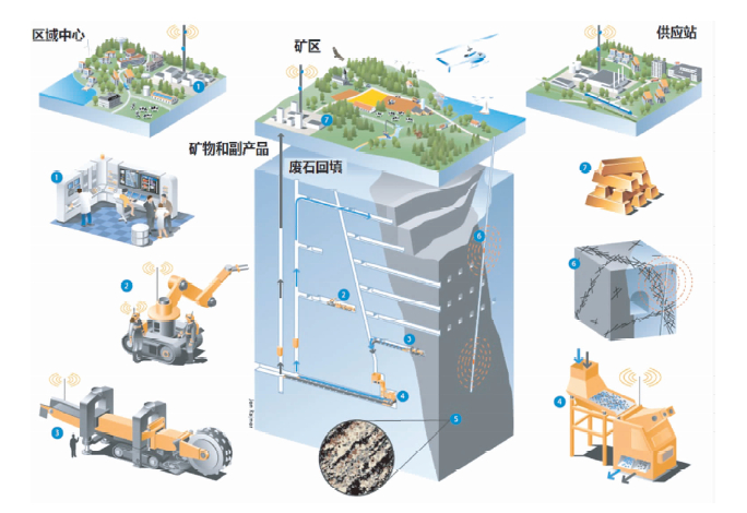 (1)一个控制室:接收与分析(网络、地下开采机械与设备的信息),控制生产过程(挖掘、输送、分离、设备维护维修、生产等),需要安装大量的传感器、摄像头,可实时进行图像的处理与分析;