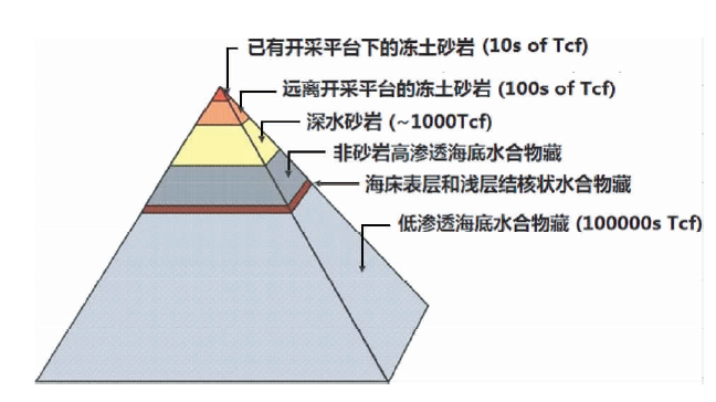 ![]() | 图 2 水合物在地层中储量的金字塔形分布 (Boswell et al., 2006) Fig. 2 Pyramid distribution of gas hydrate in sediments |