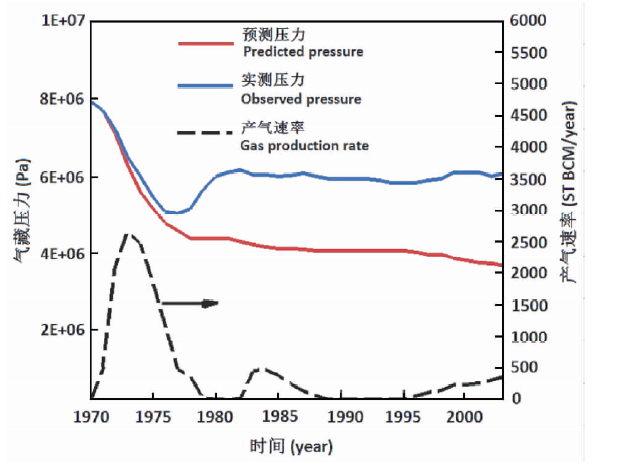 该地区由于下方常规天然气的开采,使得上部天然气水合物层的孔隙压力降低,导致天然气水合物分解并进入气田,保障了长期持续稳定的生产.该气田自1970年以来,由于水合物藏的存在而表现有如下特点(如图 3):