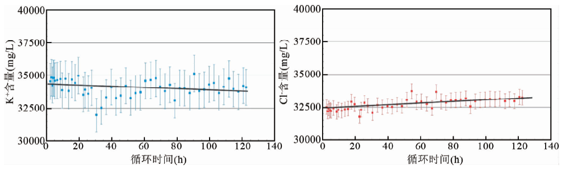 ![]() | 图 8 循环液体中离子浓度监测数据 (a)循环液体钾离子浓度时间变化曲线;(b)循环液体氯离子浓度时间变化曲线. Fig. 8 Ions monitoring data in circle solution (a)Evolution of concentration of potassium ions in the circle solution; (b)Evolution of concentration of chloride ions in the circle solution. |