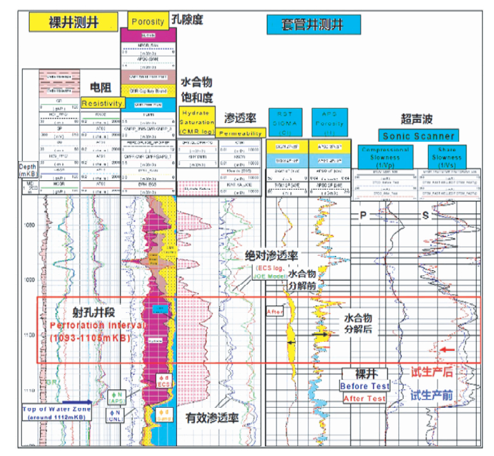“Mallik 2007/2008”试采项目,对于试采井的采气段1093~1105 m之间的数据,RST、APS以及超声波横波数据在水合物试采前后有明显的差别,这对于水合物试采过程的分析提供了很好的依据.