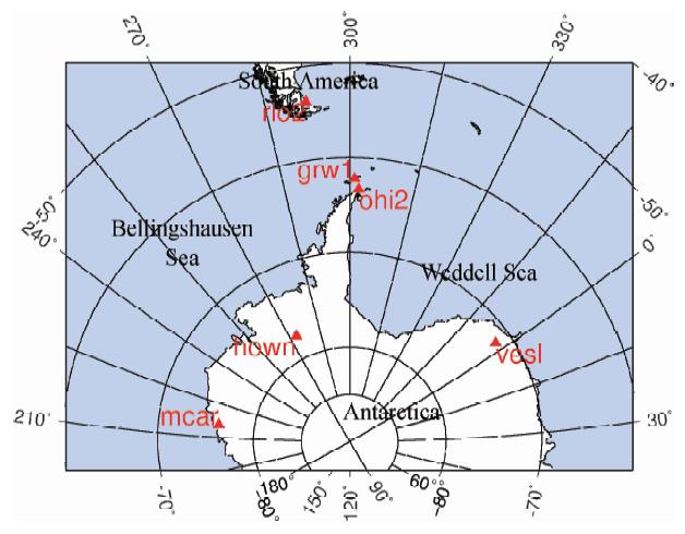 本文使用了南极地区共7个GPS常年跟踪站,分布在西南极和南美南端,如图 1所示,所选站点尽量覆盖研究区域,也就是别林斯高晋海和威德尔海.随着GPS现代化的开展,任一时刻极区测站可见卫星数可达10~12颗,这也为本文的研究提供了充分的数据支撑.