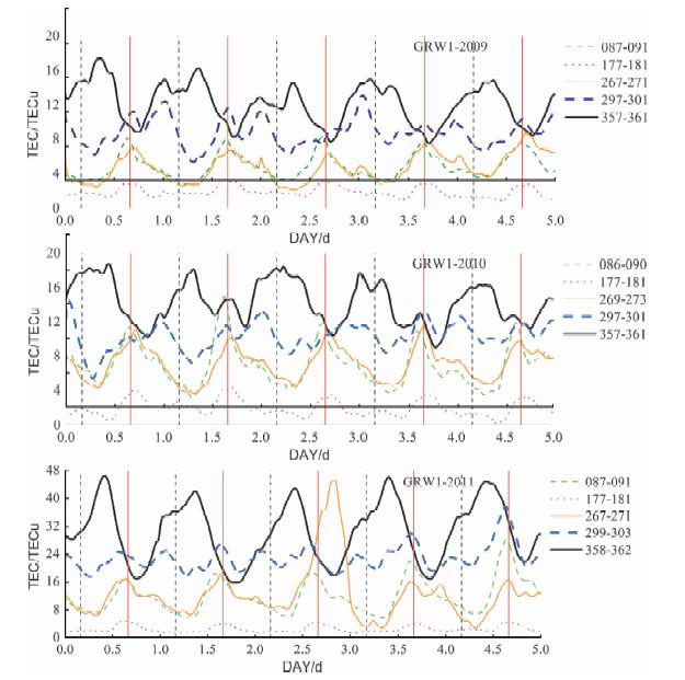 为了进一步研究威德尔海异常的变化特征,图 4为GRW1站的TEC周日变化曲线,分为春季、夏季、秋季、冬季、春夏交替5个时段,每个时段选取5天.各子图均包含2种信息,不同年积日对应的TEC变化曲线图、LT时正午和子夜对应的UT时刻.图中红色实线为地方时12时对应的UT时间,黑色虚线为LT时0时对应的UT时间.图例给出了各时段的年积日具体时间,绿色为秋季,紫色为冬季,橘色为春季,蓝色为春夏交替,黑色为夏季.