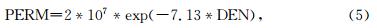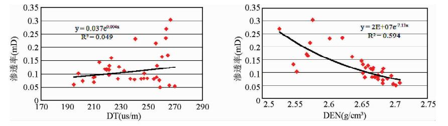 本文采用交会图方法建立页岩渗透率的解释模型.由图 3可以看出,声波时差测井与渗透率的相关性较差,而岩性密度能够较好的反映渗透率的变化.通过岩心分析数据和测井数据建立了渗透率计算公式为